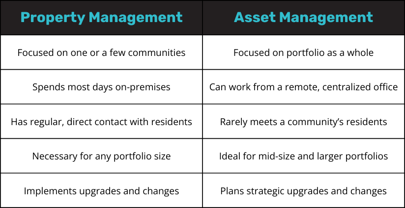 Property management focuses on the day-to-day operations at the individual community level, and property managers act as an intermediary between owners and residents. That makes them great sources of data and insights into your communities. Asset management zooms out to maximize ROI on a portfolio level, often using data provided by property management while defining the strategies that property managers will roll out.